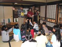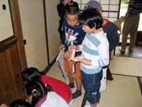 柳下邸に使われている木の本物の木片(杉・桧・松・桐・けやき・桜・黒檀)を見ながら、それぞれの木が柳下邸のどこに使われているかを、柳下邸の間取り図を見ながら探してくる。 |