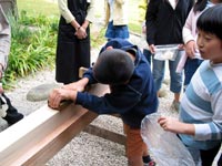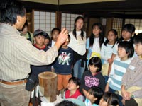 | 柳下邸にある五右衛門風呂風呂のお湯を沸かしてみました。子供達は、斧やナタを使って薪割りを体験し、焚き口から薪をくべました。温かいお湯に感激しました。 |