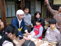 | 柳下邸の改修を手がけた大工さんから、仕口の紹介や鉋がけの実演をしてもらいました。子供達も鉋がけを体験しました。からくりのような仕口の組み方に皆びっくりでした。 |
