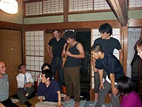 丕(はじめ)さんによる尺八の演奏などが行われました。レクチャーでは、フランス人にフランス瓦のことを丹念に説明をする兼弘さんとそれを不思議そうに聞いているファビアンさんがとても印象的でした。終始、英語、フランス語、ポルトガル語、日本語が飛び交い、また、尺八のレクチャーやブラジルのネトさんが覚えたての日本語を使ったラップのダンスやK氏のブラジルの歌の披露など、たのしいハプニングが続出し、とてもたのしいパーティーとなりました。